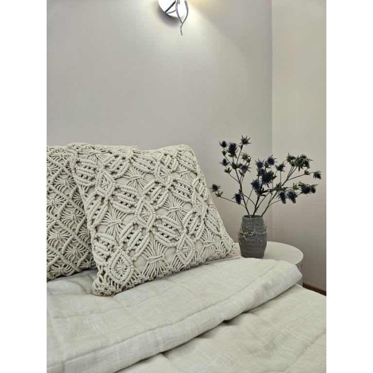 Дизайнерская подушка из высококачественного индийского хлопка со съемным чехлом на молнии станет завершающим акцентом любого интерьера. Лицевая сторона подушки сплетена из хлопкового шнура в стиле макраме. Оборотная сторона подушки однотонная со скрытой молнией. Спокойная цветовая гамма, натуральные материалы , объемное плетение сделают вашу подушку обнимательным и усыпательным дополнением дивана, кресла, детской кроватки.