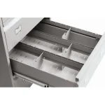 Шкаф металлический двухсекционный – подходит для хранения одежды и уборочного инвентаря. Закрывается двумя дверцами на замок. Левая секция шкафа имеет три полки, две из которых регулируются по высоте, в правой секции – одна полка, перекладина и крючки для одежды.