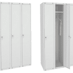 Шкаф металлический двухсекционный – подходит для хранения одежды и уборочного инвентаря. Закрывается двумя дверцами на замок. Левая секция шкафа имеет три полки, две из которых регулируются по высоте, в правой секции – одна полка, перекладина и крючки для одежды.