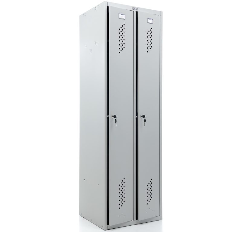 Шкаф металлический двухсекционный – подходит для хранения одежды и уборочного инвентаря. Закрывается двумя дверцами на замок. Левая секция шкафа имеет три полки, две из которых регулируются по высоте, в правой секции – одна полка, перекладина и крючки для одежды.