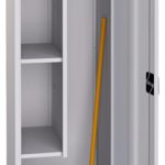 Шкаф металлический двухсекционный – подходит для хранения одежды и уборочного инвентаря. Закрывается двумя дверцами на замок. Левая секция шкафа имеет три полки, две из которых регулируются по высоте, в правой секции – одна полка, перекладина и крючки для одежды.