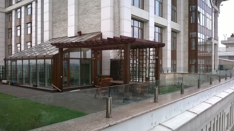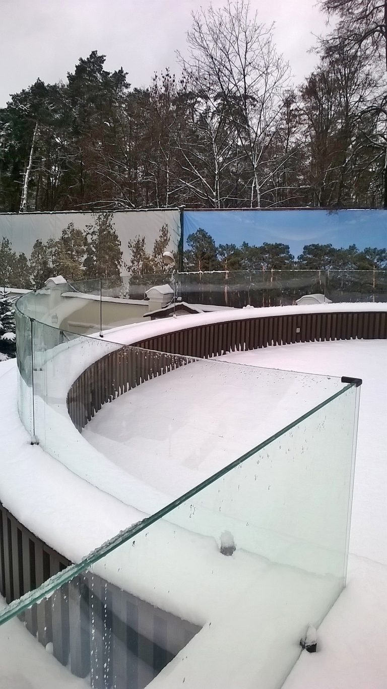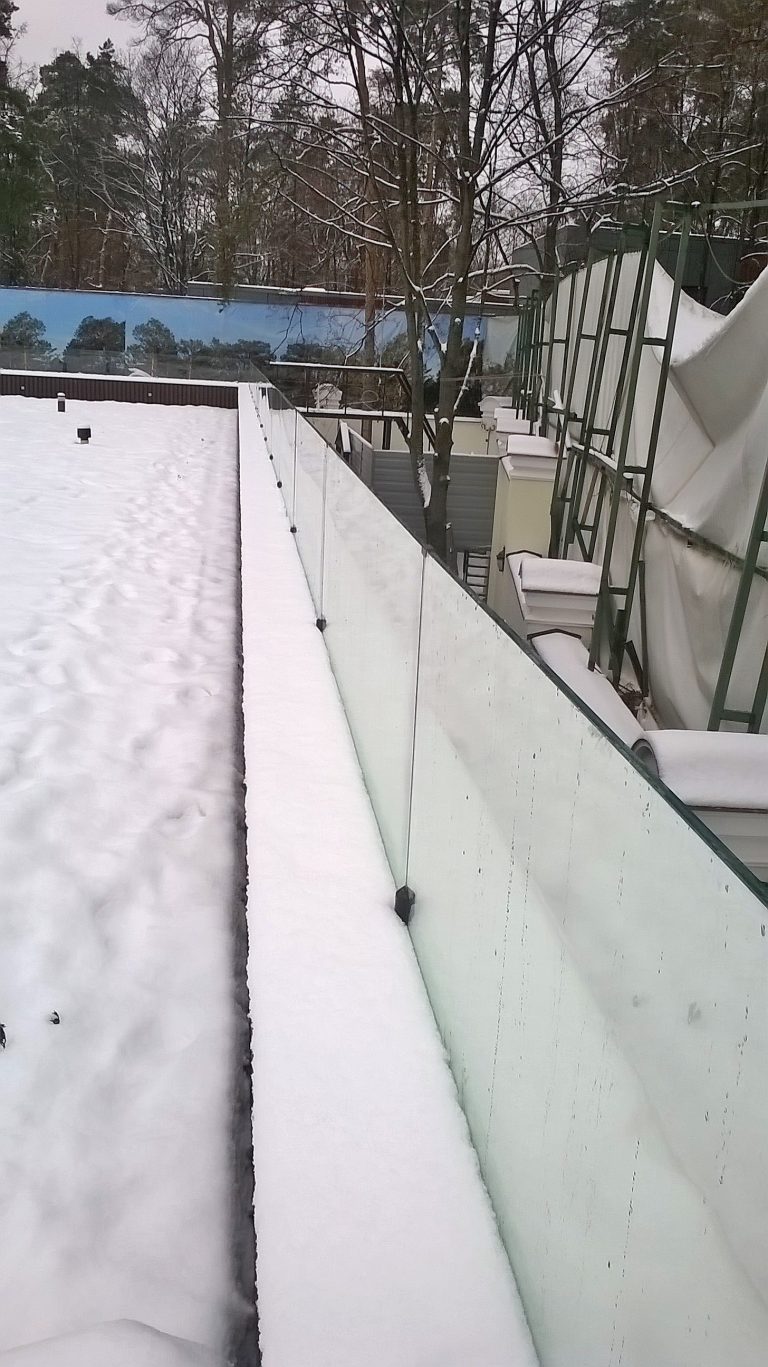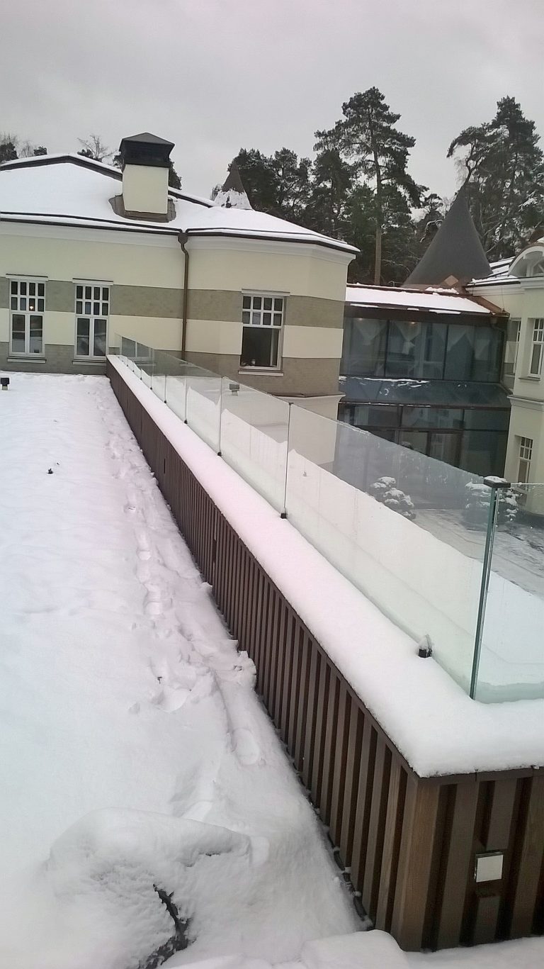 Стеклянное ограждение парапета кровли на мини стойках
