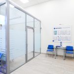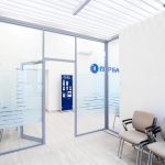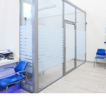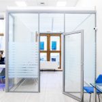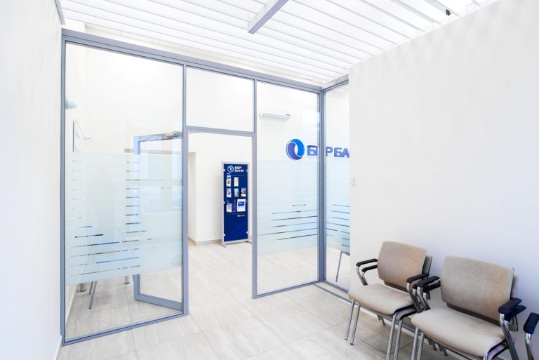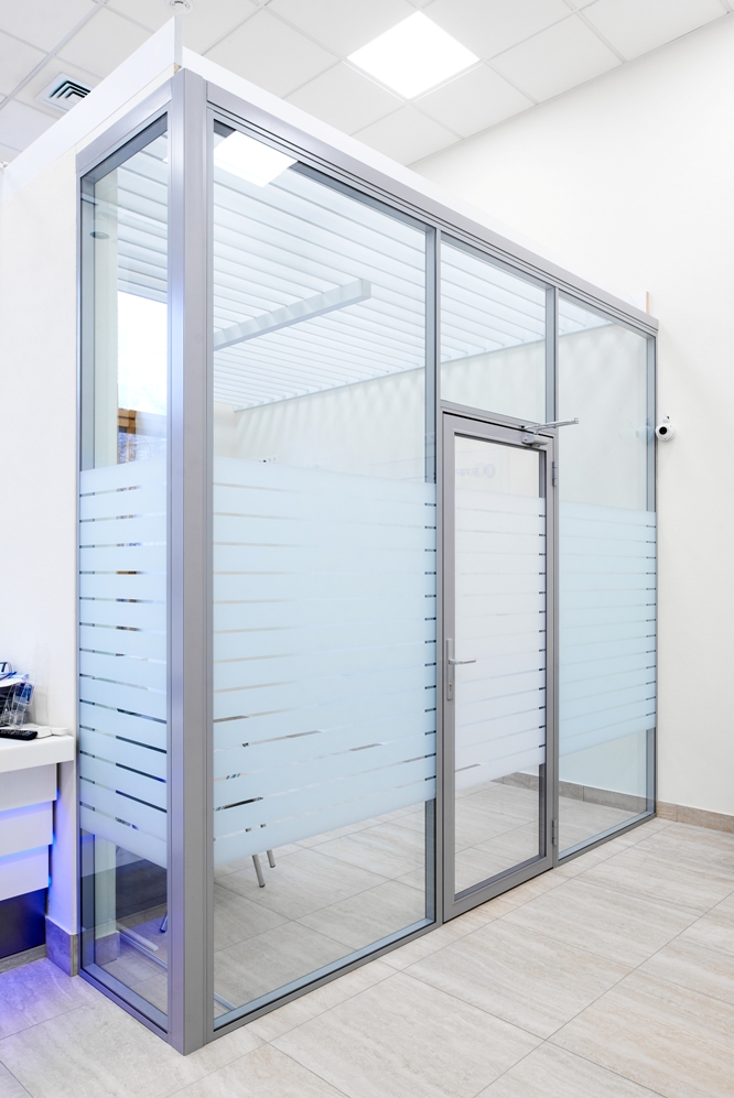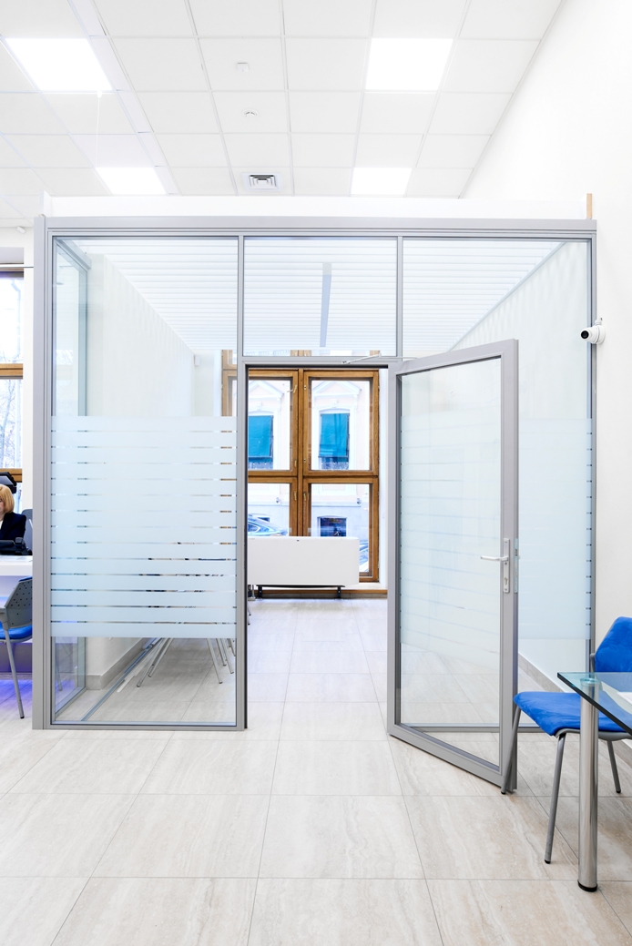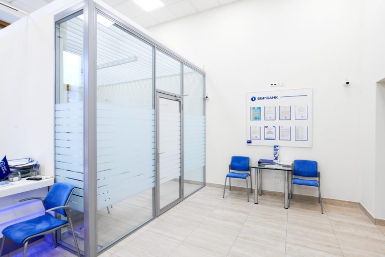 Полностью или частично остекленные перегородки для организации пространства в банке — для разделения на кабинеты, зонирования пространства, а также для формирования зоны обслуживания клиентов банка, в том числе с применением защитных экранов.